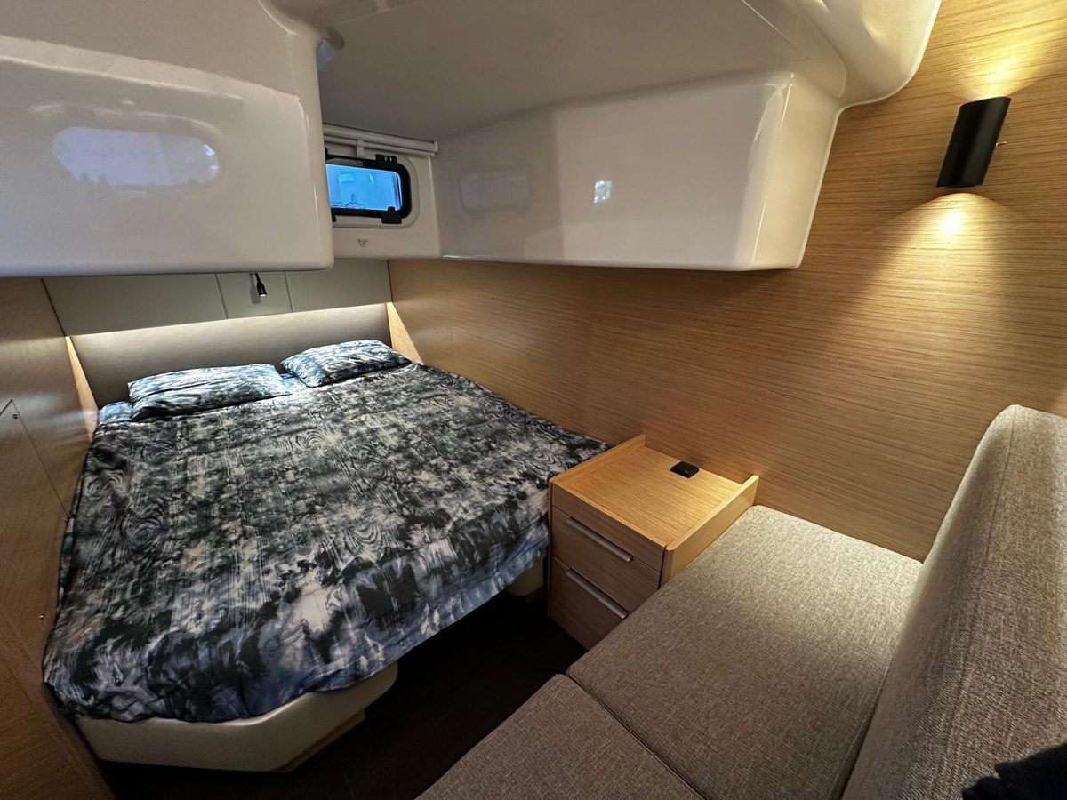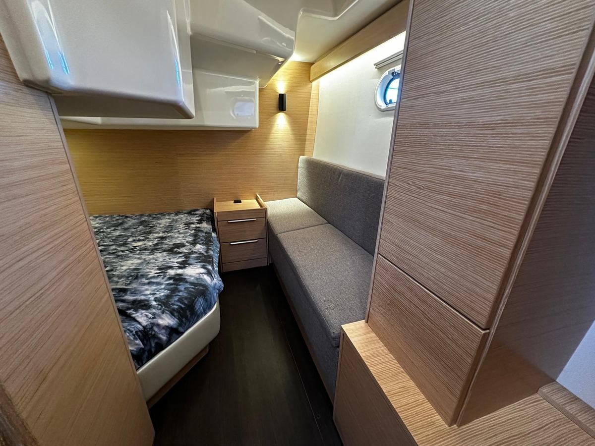 Avec ses 10 mètres de long, ce bateau offre un volume de vie exceptionnel pour sa catégorie. L’intérieur, lumineux et chaleureux, se distingue par ses boiseries claires, ses finitions soignées et ses nombreux rangements. L’éclairage élégant crée une ambiance cosy et raffinée, idéale pour profiter pleinement de chaque moment à bord.