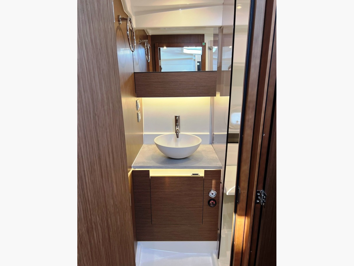 Cabine lumineuse et fonctionnelle avec couchages doubles, rangements et salle d’eau équipée (douche + WC).