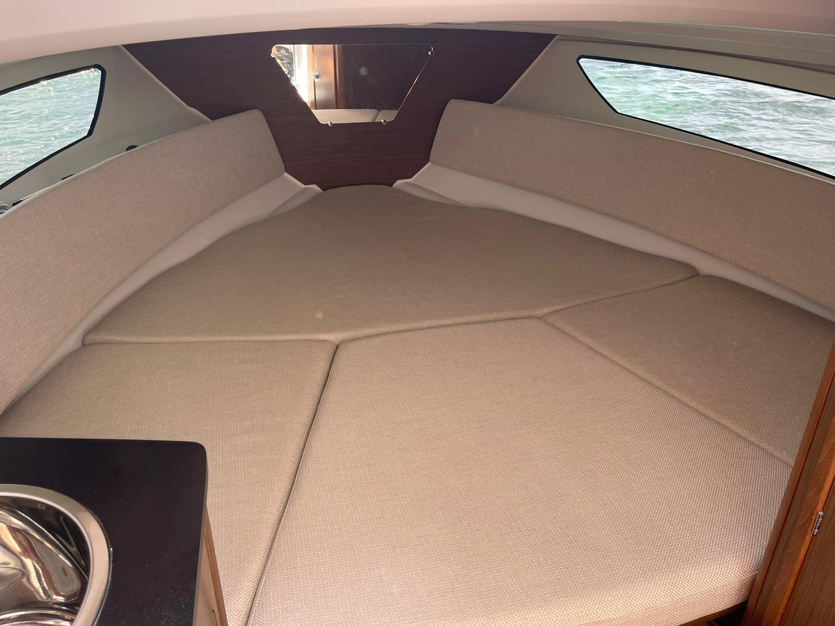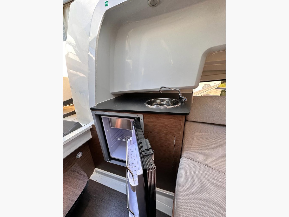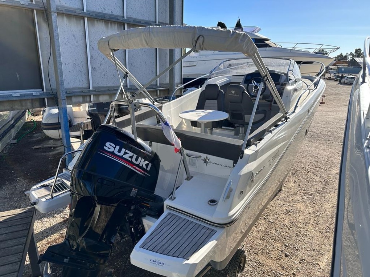 Il est équipé d’un bimini en inox, d’une table de cockpit en teck, d’un bain de soleil avant avec dossier relevable, d’un bain de soleil arrière coulissant, d’un GPS sondeur GARMIN, d’un réfrigérateur, de compléments d’assise bâbord et tribord, de plateformes arrière en teck avec main courante, d’un siège bolster, d’une prise 12V, d’un couchage double, d’un panneau de pont ouvrant et d’un porte-cannes.