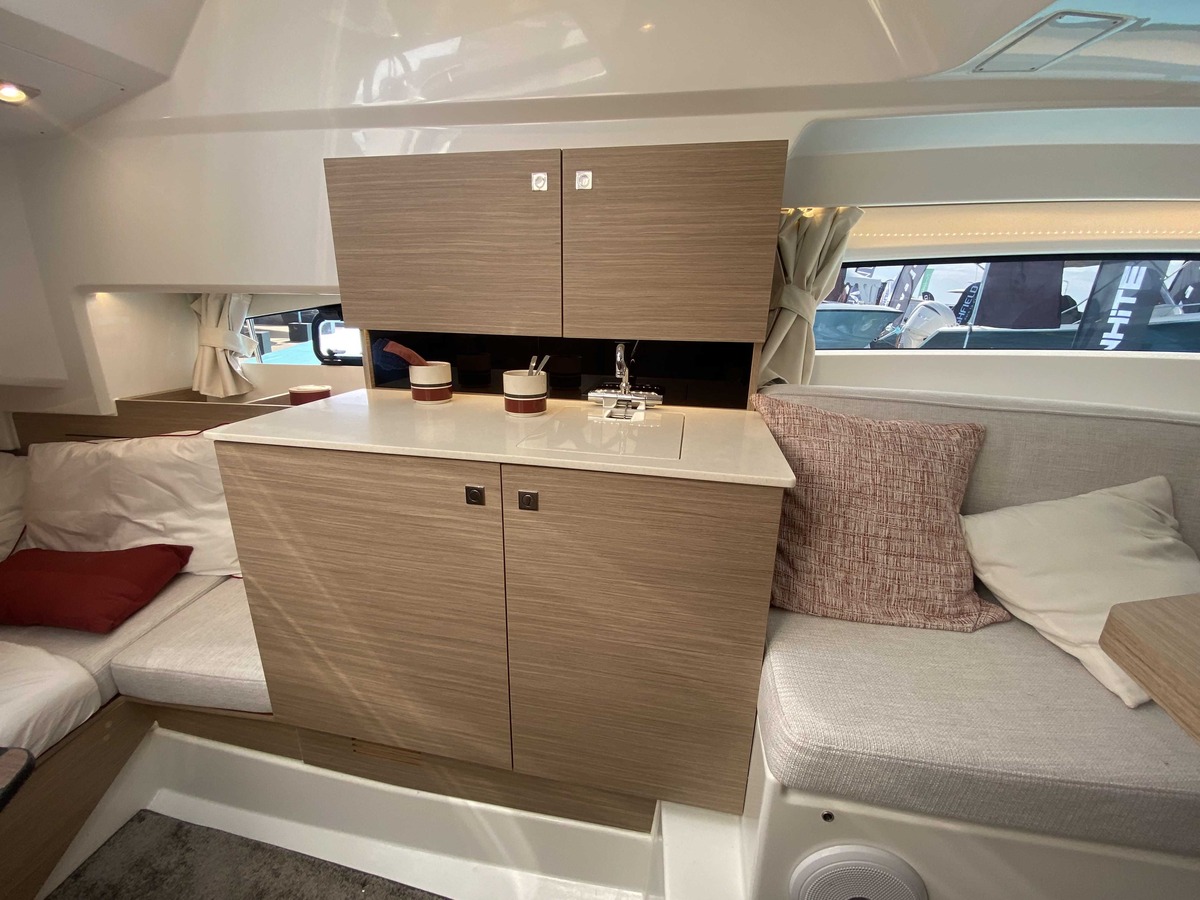Toujours présent mais repensé, le leaning post adossé aux sièges du poste de pilotage donne accès à de nombreux équipements : grill, réchaud à gaz, rangements, réfrigérateur ou même un vivier pour conserver le fruit de votre pêche. De quoi passer des moments inoubliables lors de vos sorties en mer !