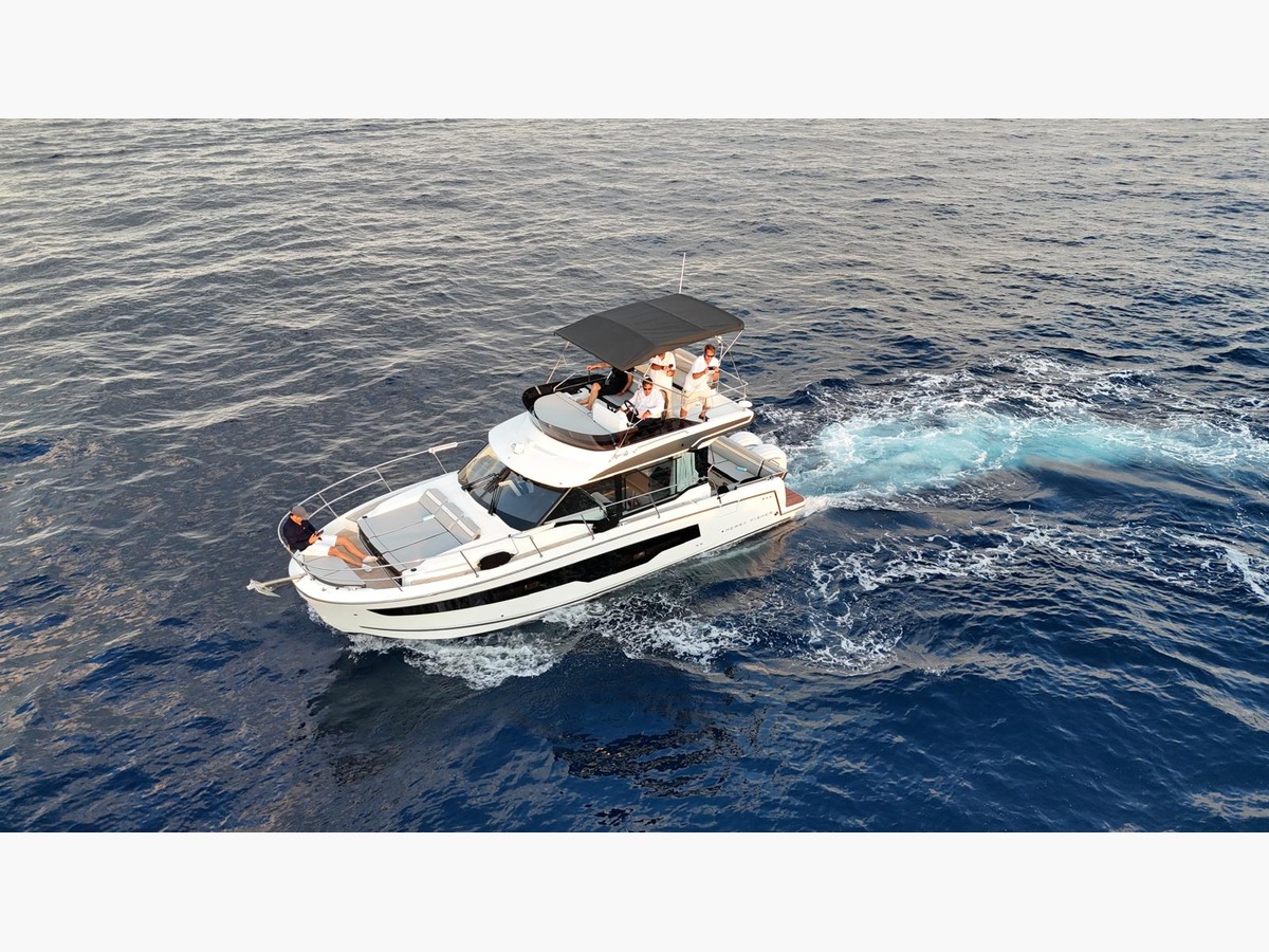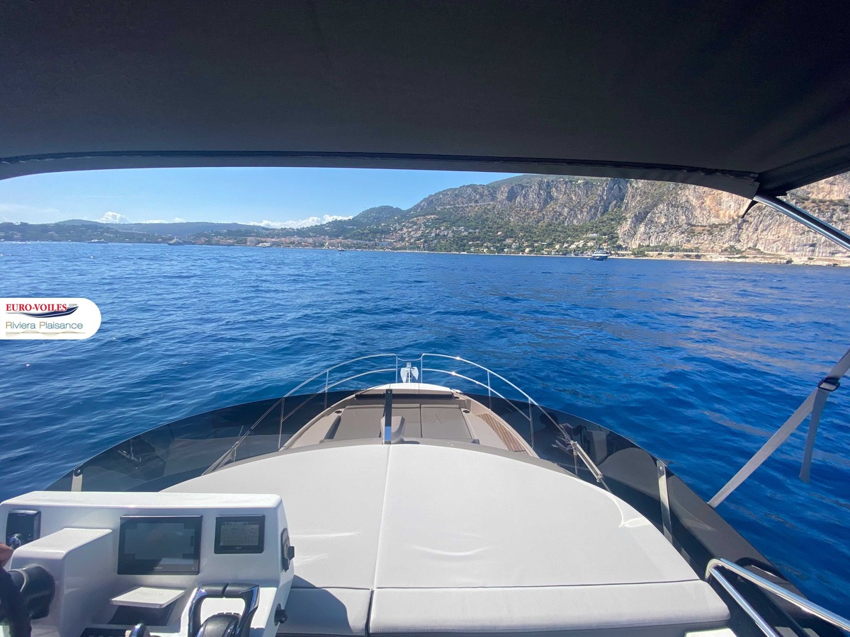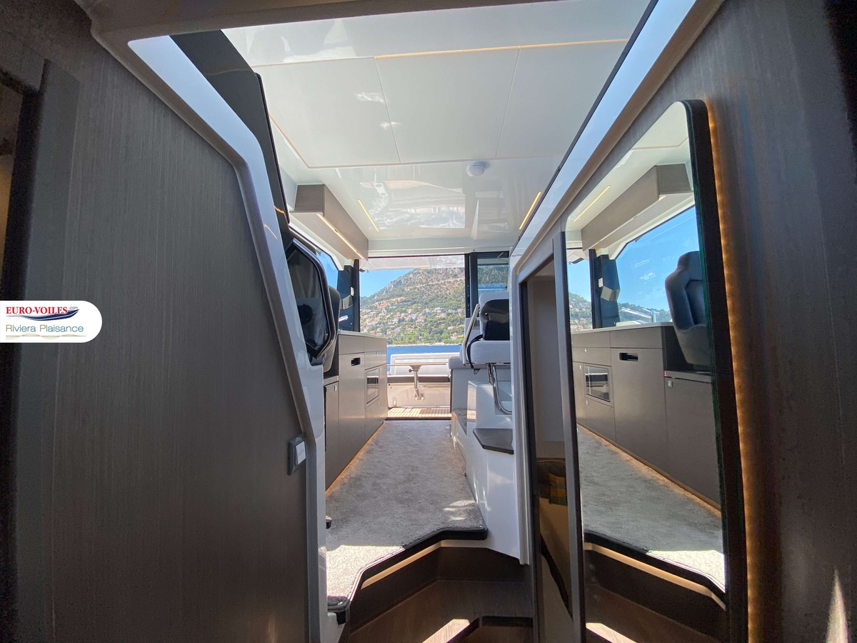 Le flybridge bénéficie d’une configuration entièrement repensée : un espace carré en vis-à-vis pour plus de convivialité, des dossiers copilote rabattables, un bain de soleil avant, un siège copilote convertible en solarium ainsi qu’un siège pilote rotatif pour une navigation plus confortable et flexible.