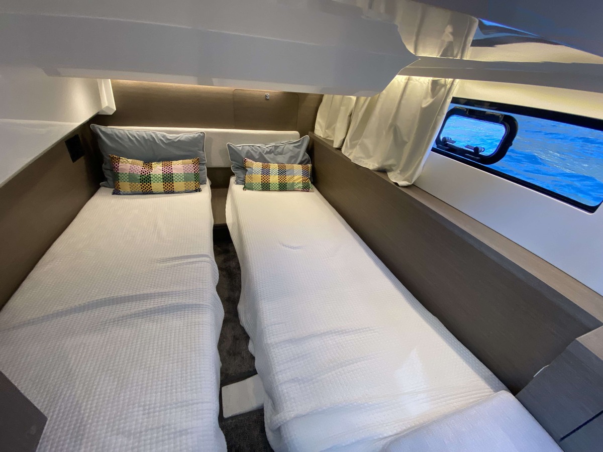 À l’intérieur, l’ergonomie a également été revue. Une nouvelle porte de cabine avant facilite la circulation à bord, tandis que la salle d’eau a été redessinée pour offrir un espace plus fonctionnel et raffiné. La seconde cabine est désormais dotée de deux couchages jumeaux, avec une option convertible selon les besoins. La cuisine séduit par ses finitions haut de gamme et de nouveaux espaces de rangement ingénieusement intégrés.