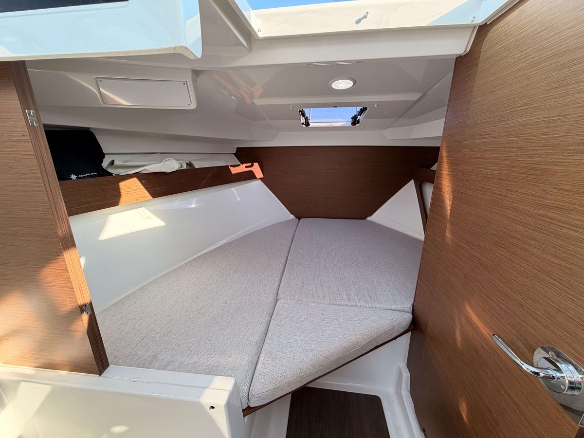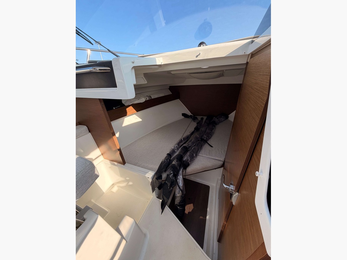 Configuration 1 cabine avant, carré transformable en couchage, jusqu’à 4 couchages et 9 personnes à bord.
