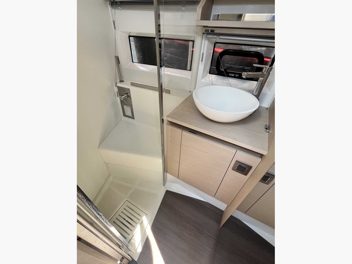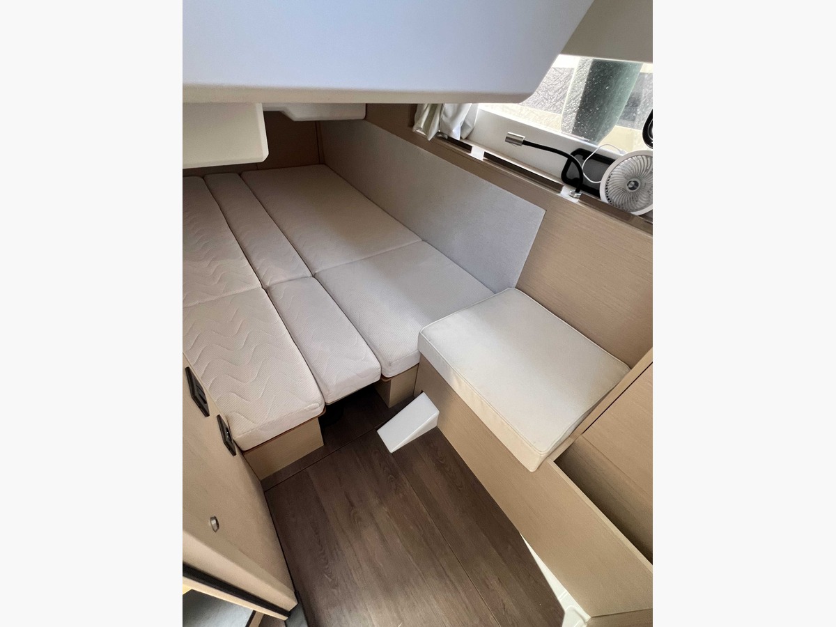 L’équipement est complet avec notamment le pack électronique Raymarine (GPS 12’’, VHF, sondeur/traceur), un système audio Fusion pour accompagner vos moments de détente, un cockpit en teck chaleureux et modulable, ainsi que des aménagements pensés pour le plaisir : grand bain de soleil avant, banquette transformable en solarium et rangements généreux. Un réfrigérateur supplémentaire et un réservoir d’eau additionnel viennent parfaire l’autonomie en croisière, tandis qu’un couchage double dans le carré permet d’accueillir confortablement famille et invités.