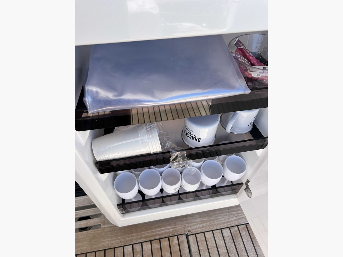 L’équipement est complet avec notamment le pack électronique Raymarine (GPS 12’’, VHF, sondeur/traceur), un système audio Fusion pour accompagner vos moments de détente, un cockpit en teck chaleureux et modulable, ainsi que des aménagements pensés pour le plaisir : grand bain de soleil avant, banquette transformable en solarium et rangements généreux. Un réfrigérateur supplémentaire et un réservoir d’eau additionnel viennent parfaire l’autonomie en croisière, tandis qu’un couchage double dans le carré permet d’accueillir confortablement famille et invités.