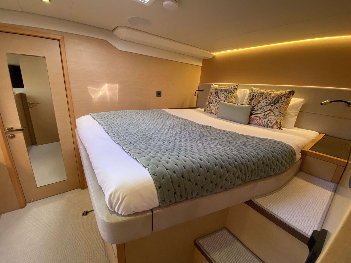 Le pont en iroko luit sous le soleil. Les coques arborent fièrement leur bleu profond Stars & Stripes, fraîchement appliqué. Sur le flybridge, le regard porte loin. Très loin. Là où commencent les rêves d’horizons. À l’intérieur, l’atmosphère invite à la détente. Boiseries en chêne blond, textiles haut de gamme, mobilier sur-mesure, chaque détail respire la qualité. On s’y sent bien, comme dans un loft flottant.