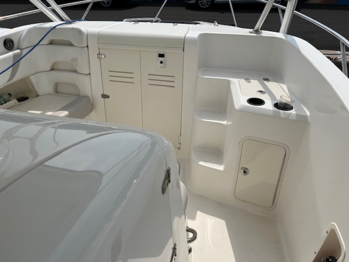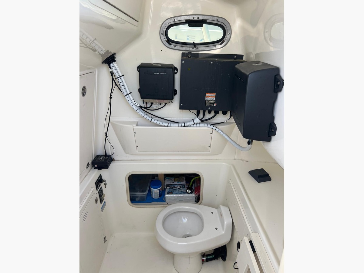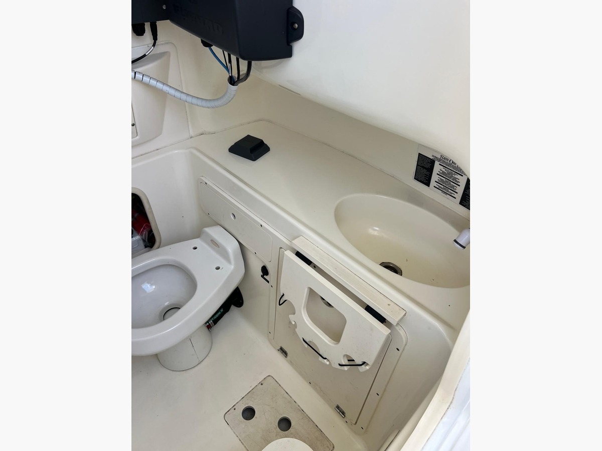The ergonomic helm with bolster seats, spacious and well-equipped cockpit, and forward cuddy cabin provide remarkable onboard comfort. Inside, you'll find a double berth, toilet area, and practical storage — perfect for extending your sea adventures in total serenity.