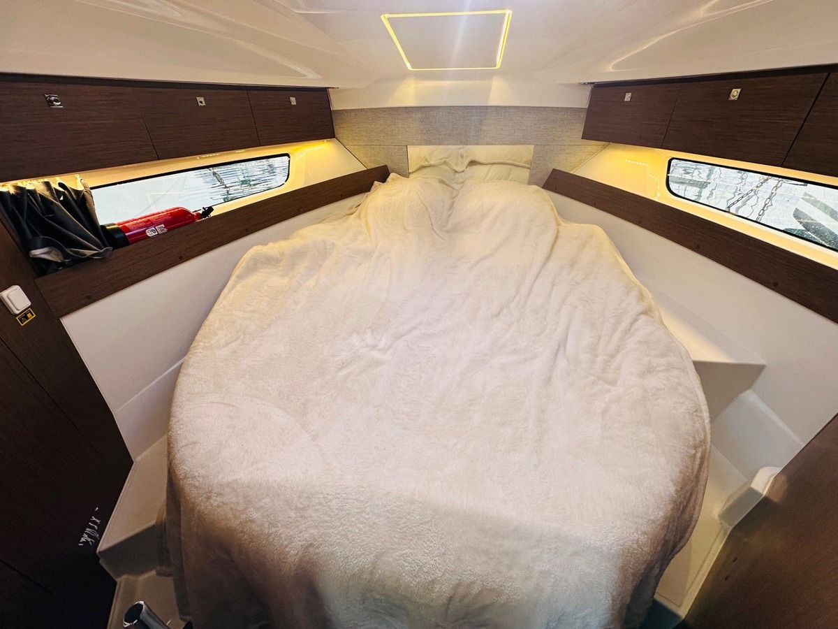 This unit features an outstanding specification, including an additional service battery with solar panel and battery management system with display for greater autonomy, bow thruster, diesel warm air heating, and a comprehensive electronics package with 12’’ Garmin display, VHF AIS, Garmin radar, autopilot, through-hull transducer plus forward-looking Panoptix transducer. A Fusion touchscreen audio system completes the helm equipment.