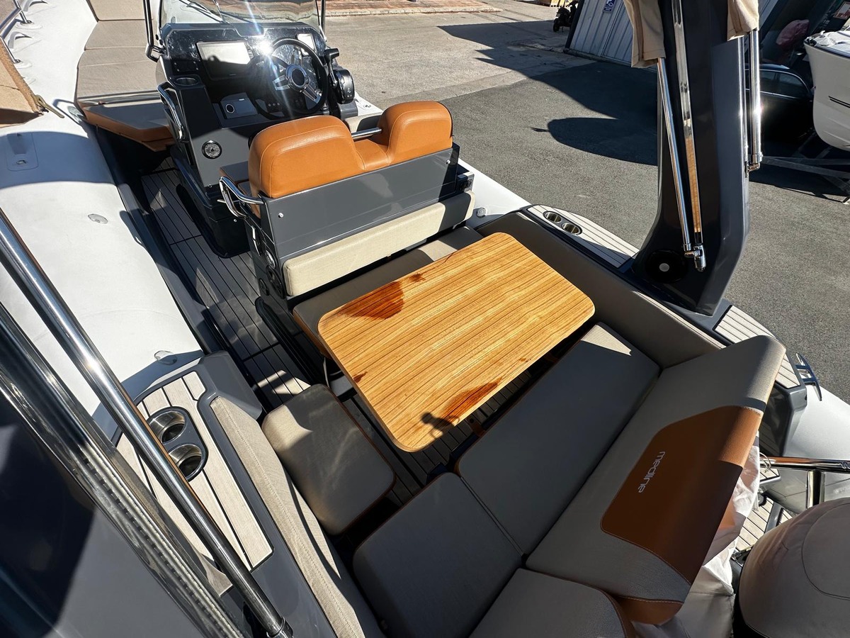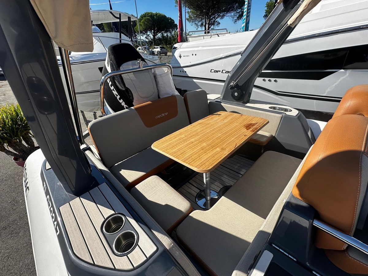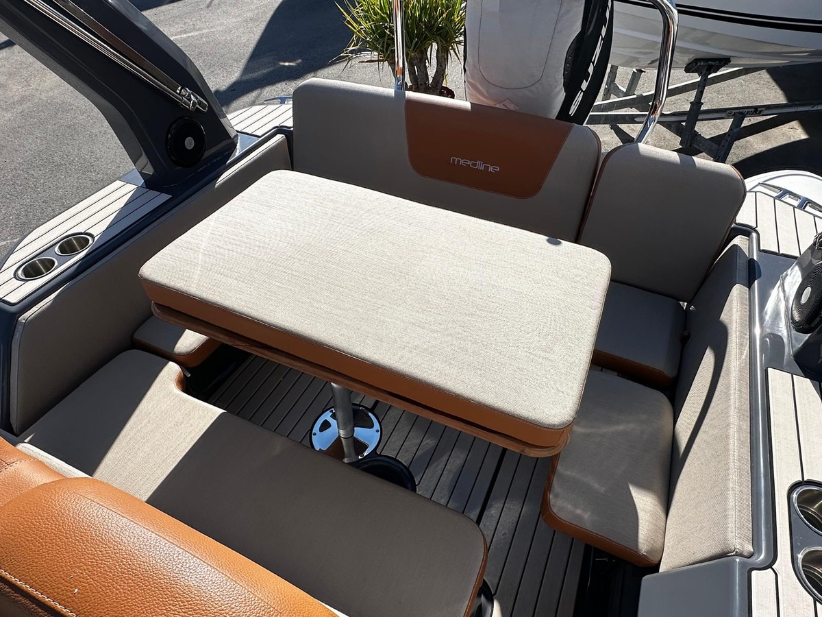 Includes: Console décor + EVA deck + Courtesy lights + Garmin 9" GPS + Fusion Audio + Ski mast + Roll bar + Slide-up bimini + Sunbed cushions & comfort backrests + Rear bolster + 2 speakers for Fusion kit + Transducer + Lounge sunbed extension + Icebox + Refrigerator + Engine data on Garmin screen + Stern transducer with temperature sensor + Electric windlass with helm switch + Forward pulpit + Medline 7.5 console handrail.